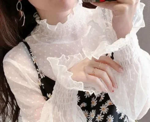 [엔젤D] 여성 도트 넥셔링 시스루 이너 레이스 블라우스