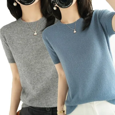 1+1 여성용 베이직 라운드넥 니트 반팔티 부드러운 니트 간절기 데일리룩 티셔츠 8A778